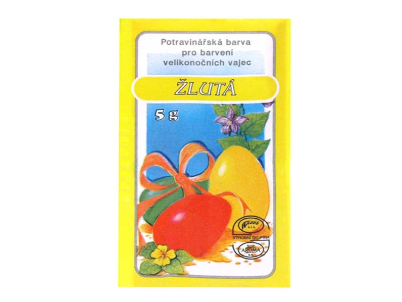 Jedno vrecko obsahuje 5 g potravinárskej farby na zafarbenie veľkonočných vajíčok na žlto. Farba nesie označenie Český výrobok. NÁVOD NA POUŽITIE: 1. Obsah vrecúška rozpustite v 1/4 l vody (70 ° C), pridajte 1-2 lyžice octu. 2. Vložte čisté, odmastené a natvrdo uvarené vajcia na 2-5 minút. 3. Zafarbené vajíčka vyberte a nechajte uschnúť. Aby sa Vám vajíčka pekne leskli, nezabudnite ich po zafarbení potrieť tukom. Roztok postačí na zafarbenie až 15 ks vajec. Uvedená cena je za 1 ks.