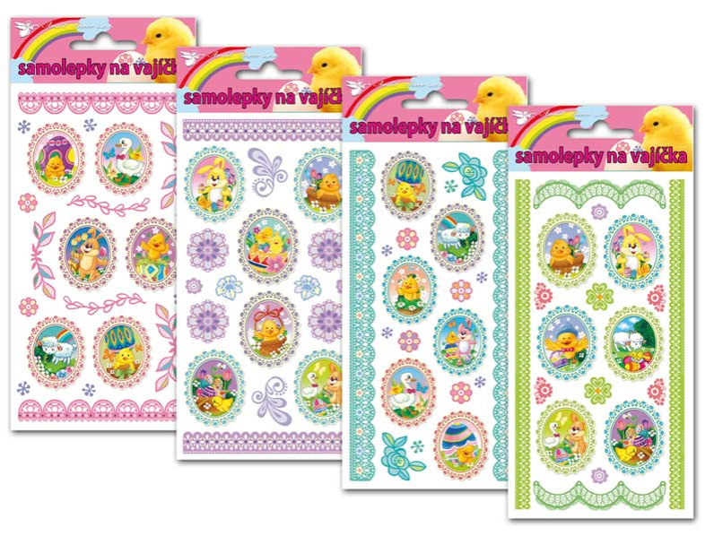 Samolepka s veľkonočnými motívmi na vajíčka. Rozmer 14 x 8 cm. Návod na použitie: Vybraný motív vystrihnite vrátane podkladového papiera a krycej fólie. Odstráňte podkladový papier a zvoľte miesto pre obrázok. Použite čisté, odmastené a suché vajce.
