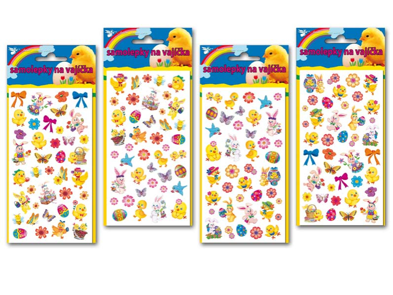Samolepky na veľkonočné vajíčka. Nájdete tu obrázky veľkonočných vajíčok, kuriatok, zajačikov a ďalších jarných a veľkonočných motívov. Rozmery: 19 x 9 cm Ako nalepiť samolepku na vajce: Na dekorovanie použite čisté odmastené a suché vajce. Odstráňte krycí papier. Opatrne odlepte vybraný obrázok z podkladovej fólie. Lepiacou stranou priložte obrázok na vajce a prstom ho uhlaďte.