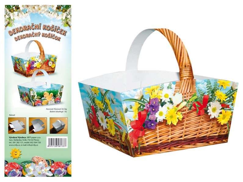 Balenie obsahuje 1ks rozloženého papierového košíčka s veľkonočným motívom. Rozmer 35 x 14 cm Nosnosť 0,5 kg