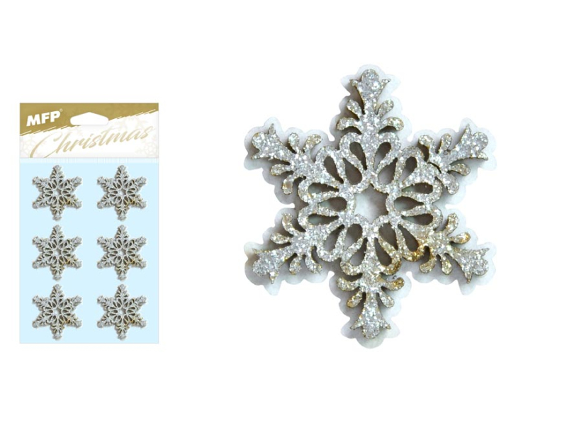 Vianočné, drevené, strieborné, snehové vločky so samolepkou a trblietkami. Ozdoba je opatrená samolepkou, takže ju možno ľahko pripevniť kamkoľvek. Ideálna na ozdobenie darčeka, pohľadnice alebo darčekovej tašky. OBSAH BALENIA: - 6 ks snehových vločiek Farba: strieborná Dodávame v sáčku so závesom. Uvedená cena je za 1 balenie.