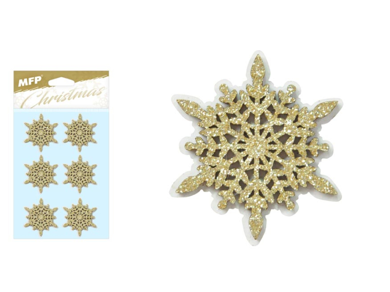 Vianočné, drevené, zlaté, snehové vločky so samolepkou a trblietkami. Ozdoba je opatrená samolepkou, takže ju možno ľahko pripevniť kamkoľvek. Ideálna na ozdobenie darčeka, pohľadnice alebo darčekovej tašky. OBSAH BALENIA: - 6 ks snehových vločiek Farba: zlatá Dodávame v sáčku so závesom. Uvedená cena je za 1 balenie.
