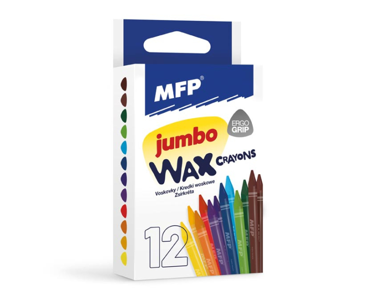 Set 12ks farebných voskoviek. Trojhranný ergonomický tvar uľahčuje deťom správne držanie. Vďaka zosileniu sú tieto voskovky vhodné aj pre malé deti. Ľahko vyprateľné z väčšiny textilií. Voskovky sú balené v papierovej krabičke. Voskovky sú zdravotne vyhovujúce.