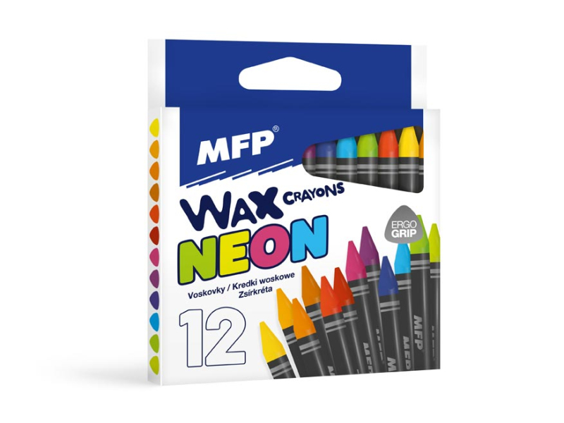 Súprava 12 ks farebných voskových kried neónových farieb. Trojhranný ergonomický tvar uľahčuje deťom správne držanie. Vďaka zosilneniu sú tieto voskovky vhodné aj pre menšie deti. Dajú sa ľahko vyprať z väčšiny textílií. Voskovky sú balené v papierovej škatuľke. Voskovky sú zdravotne neškodné. Nevhodné pre deti do 3 rokov.
