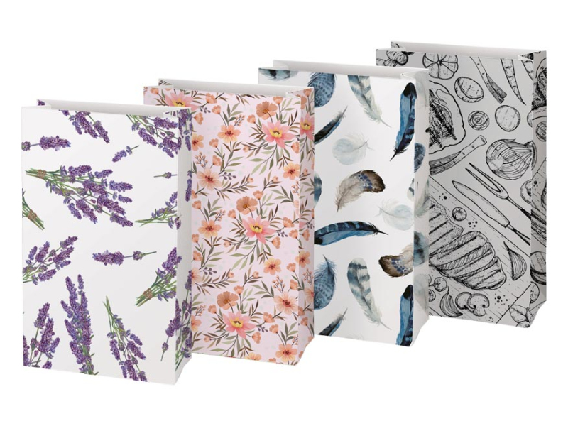 Darčekové papierové vrecúško KRAFT. Vrecúška sú vyrobené z pevného kraftového papiera. Sú ideálne na zabalenie malého darčeka, sladkostí, orieškov alebo sušeného ovocia. Na uzavretie vrecúšok môžete použiť dekoratívny kolíček, samolepiacu menovku alebo stuhu a vytvoriť tak jedinečný darček. Balenie: 12 ks Gramáž: 120 g Materiál: kraftový papier Rozmer: 100 x 180 x 60 mm Motív: levanduľa, kvety, pierka, zelenina Dodávame v mixe 4 ks podľa skladovej zásoby. Uvedená cena je za 1 ks.
