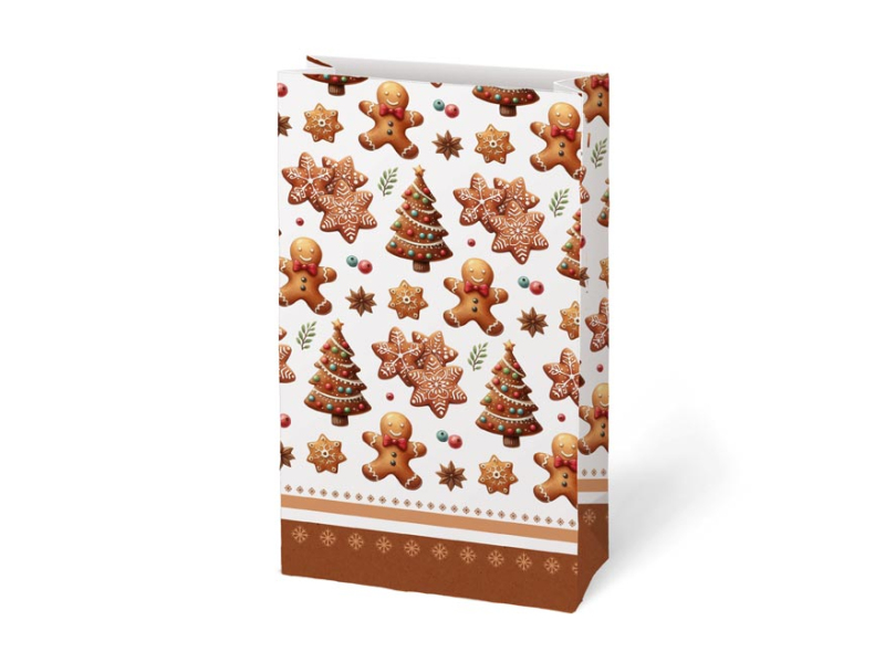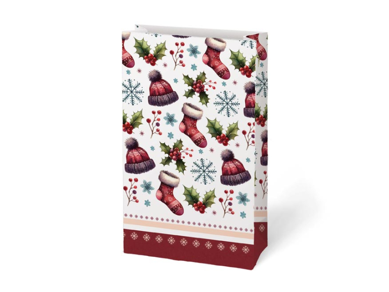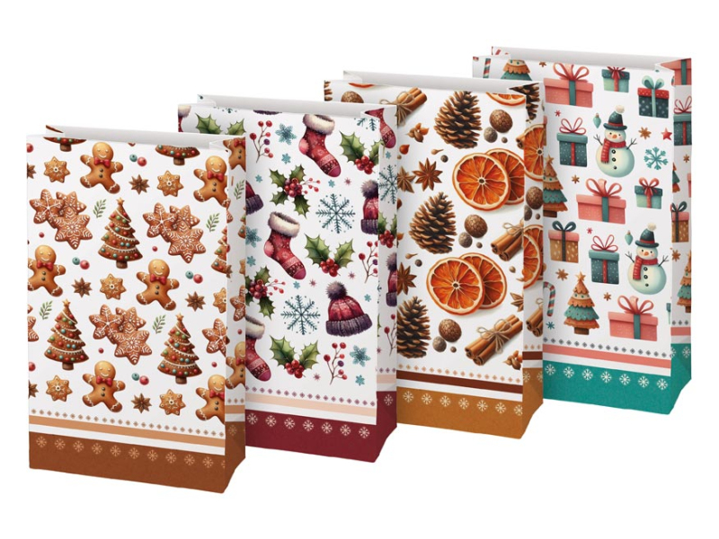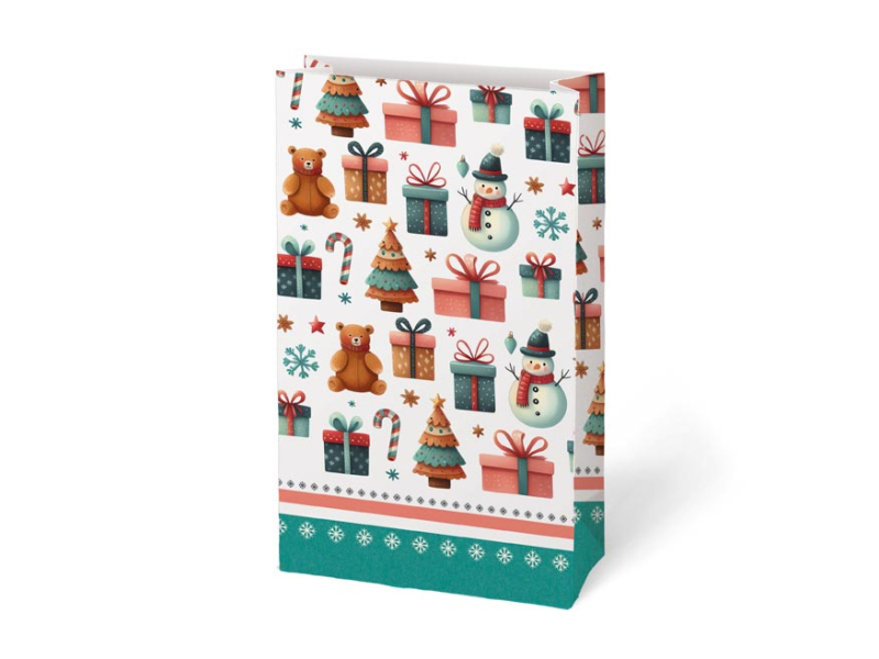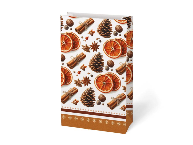 Darčekové papierové vrecko KRAFT 3 s vianočným motívom vyrobené z pevného kraftového papiera. Je ideálny na zabalenie malého darčeka, sladkostí, orieškov alebo sušeného ovocia. Na uzavretie vrecka môžete použiť dekoratívny kolíček, samolepiacu menovku alebo stuhu a vytvoriť tak jedinečný darček. Balenie: 12 ks Gramáž: 120 g Materiál: kraftový papier Rozmer: 100 x 180 x 60 mm Motív: perníčky a vianočné stromčeky, vianočné ponožky a čiapky, sušené ovocie a korenie, vianočné darčeky a medvedíci Dodávame v mixe 4 ks podľa skladovej zásoby. Uvedená cena je za 1 ks.