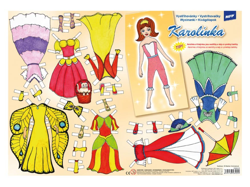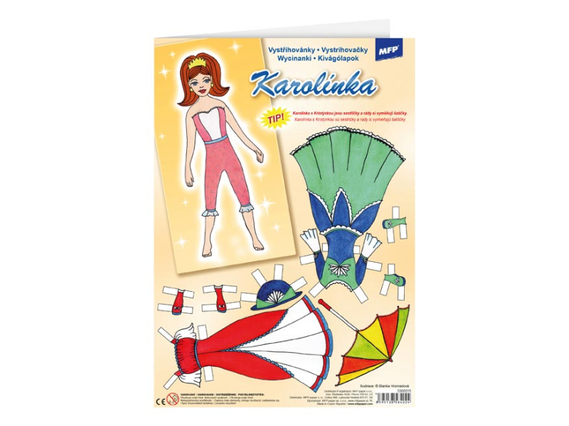 Vystrihovačky s princeznou Karolínkou, vhodné pre mladé slečny. Obleč si princeznú Karolínku podľa svojho vlastného vkusu. Vystrihovačky sú na 2 listoch formátu A4. Nájdeš tu princeznú, veľa rôznych šiat, črievičiek a doplnkov. Vystrihovačky rozvíjajú kreativitu detí pomocou rôznych tvarov, farieb a taktiež zlepšujú motoriku ruky. NÁVOD: 1. Podľa obrysu si vystrihni princeznú a oblečky. 2. Vyber si ten správny obleček a pomocou bielych prúžkov ho zahni okolo siluety princeznej (biele prúžky slúžia k záhybu). 3. Oblečky môžeš jednoducho meniť, kedy sa ti zachce. Papier: 235 g + lamino VAROVANIE: Nevhodné pre deti do 3 rokov. Nebezpečenstvo vdýchnutia a prehltnutia malých častíc. Uvedená cena je za 1 ks.