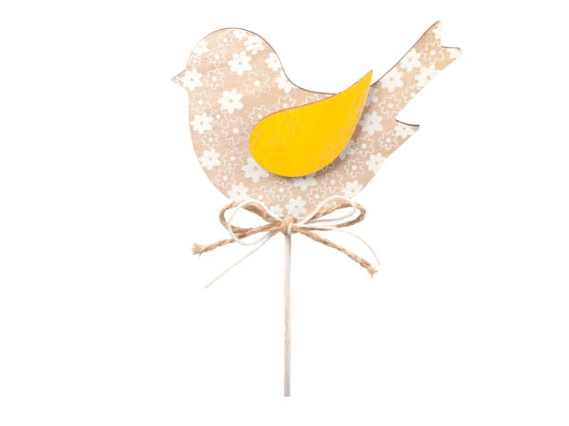 Drevený zápich vtáčik v krémovej farbe. Vtáčik má žlté krídielko a je zdobený bielymi kvetmi. Zápich je ideálnym doplnkom do vašich jarných kvetináčov alebo kvetov vo váze. Farba: krémová Materiál: preglejka Celková dĺžka zápichu: 310 mm Uvedená cena je za 1 ks.