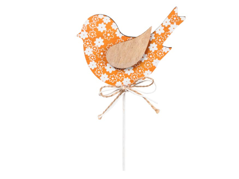 Drevený zápich vták v oranžovej farbe. Vtáčik má krídielko v prírodnej farbe a je zdobený bielymi kvetmi. Zápich je ideálnym doplnkom do vašich jarných kvetináčov alebo kvetov vo váze. Farba: oranžová Materiál: preglejka Celková dĺžka zápich: 310 mm Uvedená cena je za 1 ks.