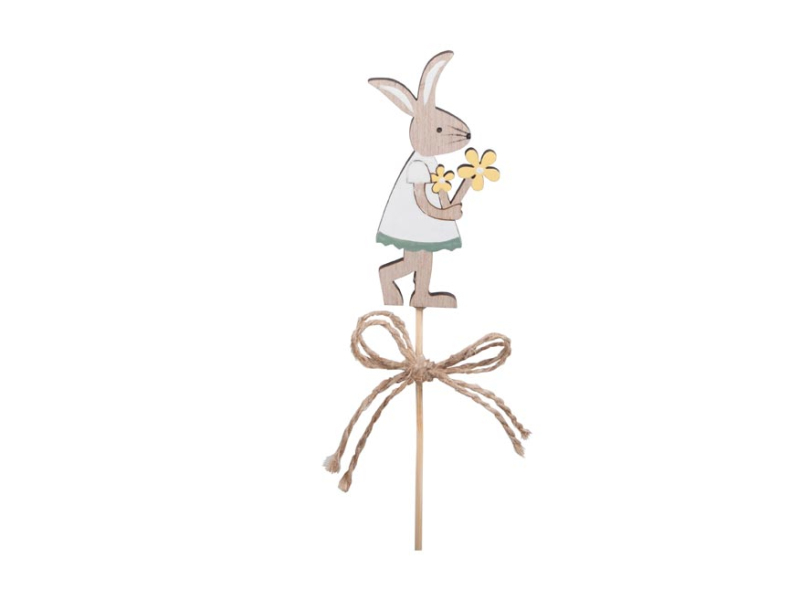 Veľkonočný drevený zápich zajačik s kvetom. Zápich je ideálnym doplnkom do vašich jarných truhlíkov alebo kvetov vo váze. Privítajte sviatky jari s touto krásnou dekoráciou. Materiál: preglejka Výška figúrky: 75 mm Celková dĺžka zápichu: 275 mm Uvedená cena je za 1 ks.