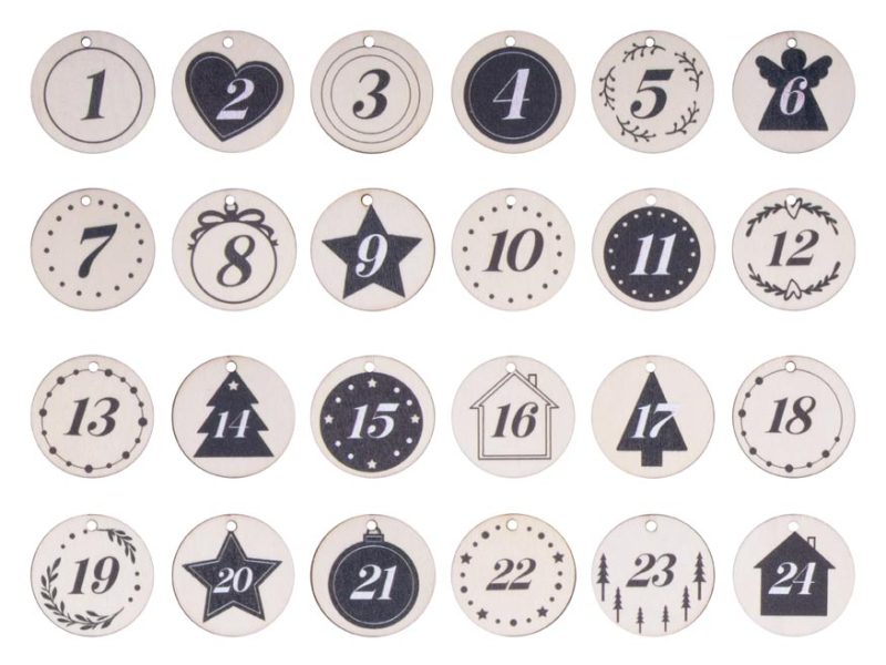 Drevené adventné kolieska. Krásne, drevené kolieska na zavesenie. Ľahko si tak vytvoríte adventný kalendár a skrášlite svoj interiér. Balenie obsahuje: - 24 ks kolečiek Materiál: drevo Veľkosť: 40 mm Uvedená cena je za 1 balenie.