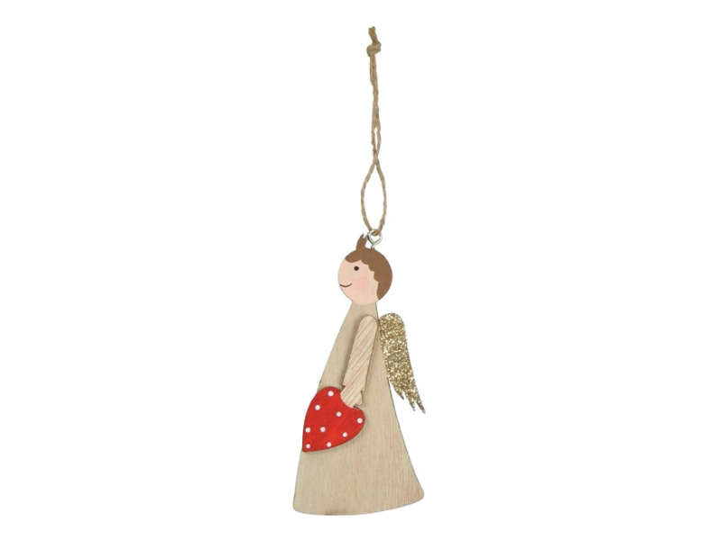 Vianočná, drevená dekorácia anjel so srdcom na zavesenie. Krásny závesný anjel držiaci červené srdce je opatrený šnúrkou na zavesenie. Môžete ho zavesiť na stromček, do okna alebo na dvere. Skrášli váš interiér a umocní vianočnú atmosféru. Materiál: drevo Veľkosť: 120 mm Cena je uvedená za 1 ks.