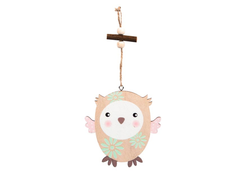 Krásna veľkonočná dekorácia v dizajne drevenej sovy s otvorenými očami. Sova má ružové krídla a je ozdobená zelenými kvetmi. Dekorácia má jutovú šnúrku na jednoduché zavesenie, ktorá je zdobená korálkami a drevom. Poslúži ako dekorácia do exteriéru alebo interiéru. Materiál: drevo Veľkosť: 10 cm Farba: prírodná Uvedená cena je za 1 ks.