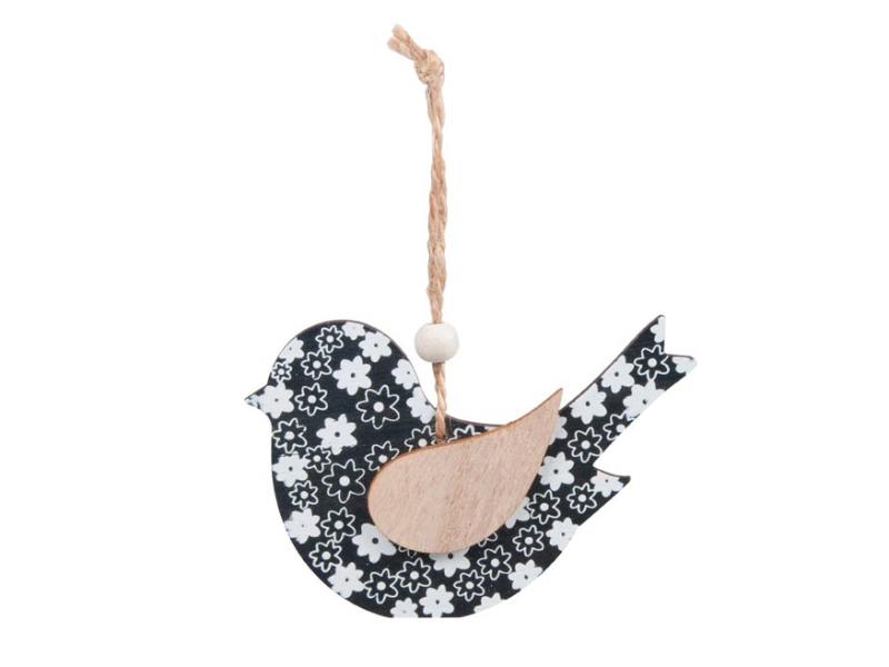 Krásna veľkonočná dekorácia v dizajne dreveného vtáčika. Vtáčik je v čiernej farbe s bielymi kvetmi a krídlom v prírodnej farbe. Dekorácia má jutovú šnúrku s korálkou na jednoduché zavesenie. Poslúži ako dekorácia do exteriéru alebo interiéru. Balenie obsahuje: - 2 ks dekorácií ( vtáčik) Farba: čierna Materiál: drevo Rozmery: 170 x 100 mm Dodávame vo vrecku so závesom. Uvedená cena je za 1 balenie.