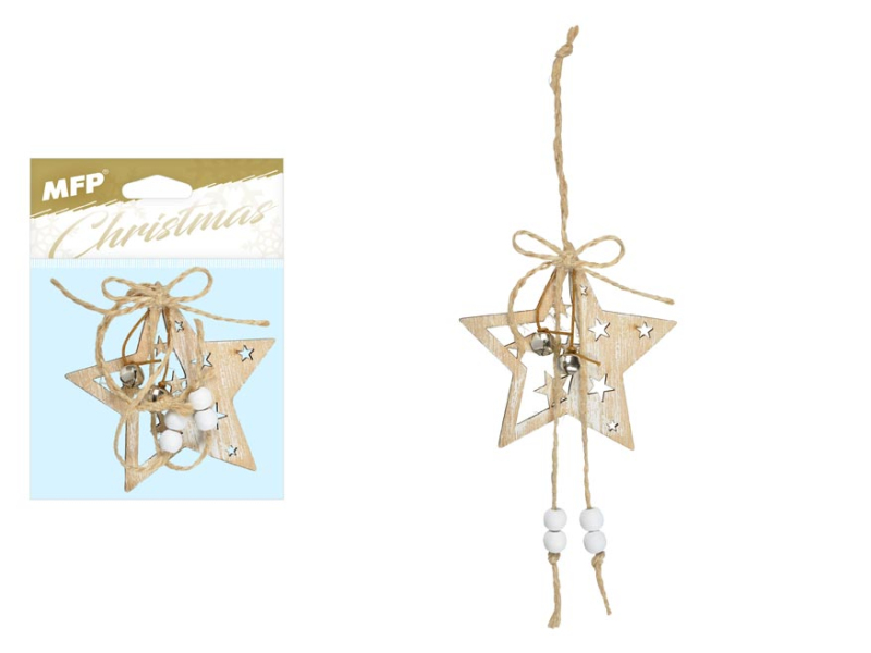 Vianočná, drevená ozdoba hviezda so zvončekmi a závesom. Táto ozdoba sa dodáva so šnúrkou na jednoduché zavesenie. Môžete ju použiť na ozdobenie vianočného stromčeka, zavesiť ju na dvere, okno a skrášliť si tak svoj domov. Veľkosť: 80 mm Dodávame v sáčku so závesom. Uvedená cena je za 1 ks.