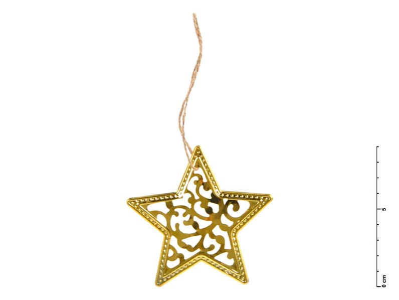 Vianočná kovová dekorácia hviezda v zlatej farbe so závesom. Vianoce sú sviatkami pohody a pokoja, a preto je potrebné sa na ne poriadne pripraviť. Vyzdobte si domov touto krásnou kovovou dekoráciou, ktorá Vám navodí pocit prichádzajúcich Vianoc. Táto vianočná ozdoba je opatrená očkom a povrázkom na zavesenie. Môžete použiť na ozdobenie vianočného stromčeka, zavesiť na dvere, okno a skrášliť tak Vaše bývanie. Farba: zlatá Veľkosť: 90 mm Uvedená cena je za 1 ks.