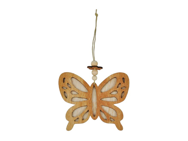 Krásna veľkonočná dekorácia v dizajne dreveného motýľa v prírodných farbách so závesom slúži ako dekorácia do exteriéru alebo na skrášlenie interiéru. Dekorácia má šnúrku na zavesenie. Veľkosť: 100 mm Uvedená cena je za 1 ks.