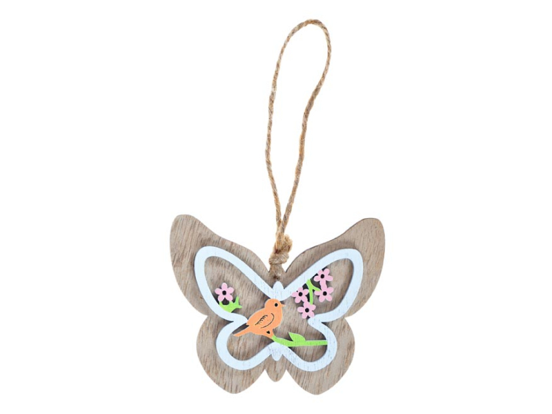 Veľkonočná drevená dekorácia 3D záves s motívom motýlika. Vyzdobte si byt veľkonočnými dekoráciami a tak privítajte sviatky jari. Túto dekoráciu môžete použiť na dekorovanie veľkonočných vencov alebo vetvičiek. Dekorácia obsahuje výrez s ďalšími veľkonočnými motívmi a šnúrku na zavesenie. Veľkosť: 10 cm Dodávame vo vrecku so závesom. Uvedená cena je za 1 ks.