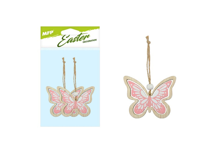 Krásna, veľkonočná dekorácia v dizajne dreveného ružového motýľa so závesom, poslúži ako dekorácia do exteriéru alebo na skrášlenie interiéru. Dekorácia má povrázok na zavesenie. Balenie obsahuje: - 2 ks dekorácií (motýľ) Veľkosť: 70 mm Uvedená cena je za 1 ks.