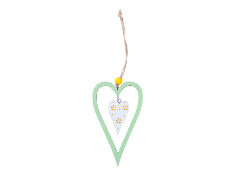 Krásna veľkonočná dekorácia v dizajne dreveného zeleného a bieleho srdca so závesom. Poslúži ako exteriérová dekorácia alebo na skrášlenie interiéru. Dekorácia má šnúrku s korálkou na zavesenie. Veľkosť: 120 mm Uvedená cena je za 1 ks.