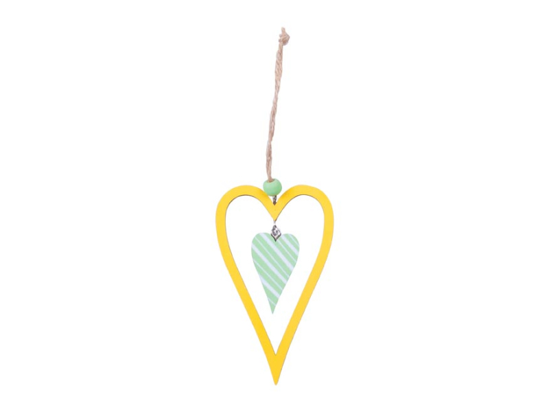Krásna veľkonočná dekorácia v dizajne dreveného žltého a zeleného srdca so závesom. Poslúži ako exteriérová dekorácia alebo na skrášlenie interiéru. Dekorácia má šnúrku s korálkou na zavesenie. Veľkosť: 120 mm Uvedená cena je za 1 ks.