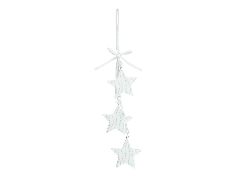 Vianočná drevená dekorácia 3 hviezdy so závesom. Hviezdy sú vyrezané z lisovaného dreva a sú umiestnené jedna za druhou v závese. V hornej časti je očko so šnúrkou a korálkou, ktoré umožňuje jednoduché zavesenie. Ozdobu môžete zavesiť na dvere, okno alebo inak skrášliť svoj domov. Dĺžka: 400 mm Veľkosť jednej hviezdy: 70 mm Uvedená cena je za 1 kus.