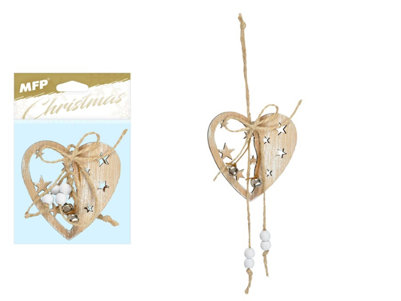 Vianočná drevená ozdoba srdca s rolničkami a závesom. Táto ozdoba sa dodáva so šnúrkou na jednoduché zavesenie. Môžete ju použiť na ozdobenie vianočného stromčeka, zavesiť na dvere, okno a skrášliť si tak svoj domov. Veľkosť: 80 mm Dodávame v sáčku so závesom. Uvedená cena je za 1 ks.