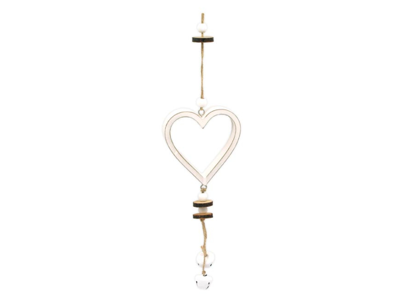 Vianočná drevená dekorácia srdca so závesom v bielej farbe. Súčasťou sú rolničky a korálky. Vyrobené z preglejky a prírodných materiálov. Táto dekorácia je opatrená očkom a povrázkom na zavesenie. Vhodná na zavesenie do dverí, do okna alebo na stenu. Dodávame v sáčku so závesom. Uvedená cena je za 1 ks.