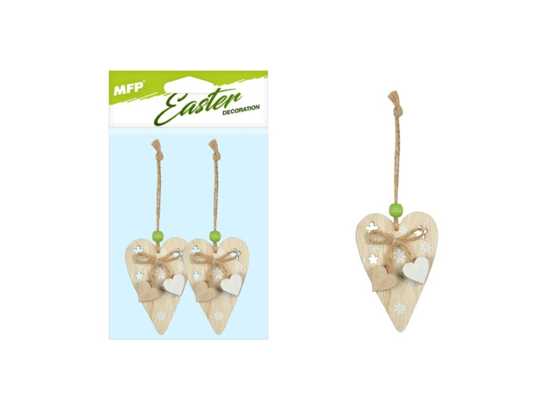 Krásna veľkonočná dekorácia v dizajne dreveného srdiečka so závesom, poslúži ako dekorácia do exteriéru alebo na skrášlenie interiéru. Dekorácia má povrázok na zavesenie. Balenie obsahuje: - 2 ks dekorácií (srdiečka) Veľkosť: 80 mm Uvedená cena je za 1 ks.