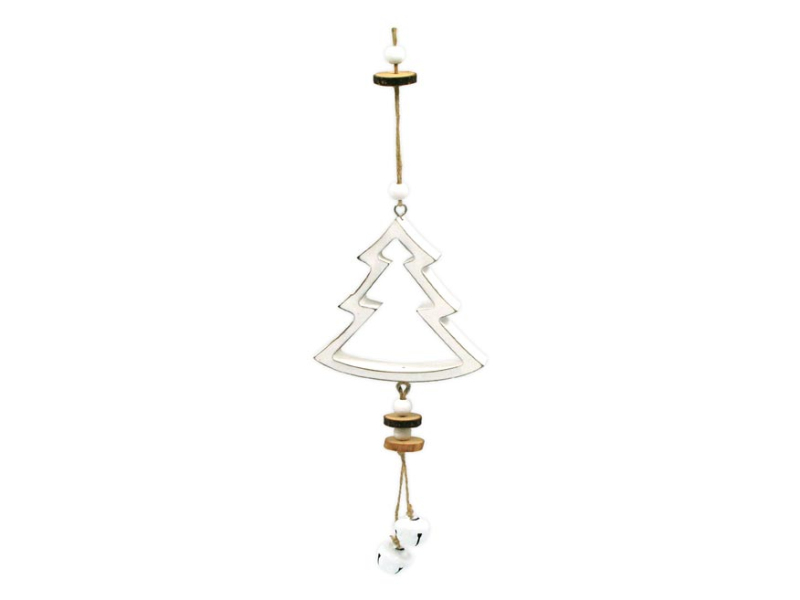 Vánoční dřevěná dekorace stromek v bílé barvě se závěsem. Vyrobená z přírodních materiálů. Součástí jsou dvě malé rolničky a korálky. Tato dekorace je opatřena očkem a provázkem na zavěšení. Vhodný na zavěšení do dveří, do okna nebo na zeď. Materiál: dřevo Dodáváme v sáčku se závěsem. Uvedená cena je za 1 ks.