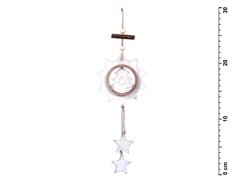 Vianočná, drevená dekorácia stromček v bielej farbe s hviezdičkami a závesom. Vianočná ozdoba je vybavená korálkami a šnúrkou na zavesenie. Vhodná na zavesenie do okna, na stenu alebo na dvere. Materiál: drevo Veľkosť: 300 mm Dodávame vo vrecku so závesom. Uvedená cena je za 1 ks.