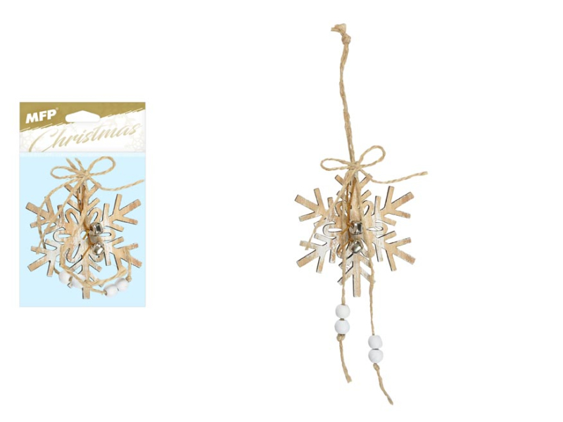 Vianočná drevená ozdoba snehová vločka s rolničkami a závesom. Táto dekorácia sa dodáva so šnúrkou na jednoduché zavesenie. Môžete ju použiť na ozdobenie vianočného stromčeka, zavesiť ju na dvere, okno a skrášliť si tak svoj domov. Veľkosť: 80 mm Dodávame v sáčku so závesom. Uvedená cena je za 1 kus.