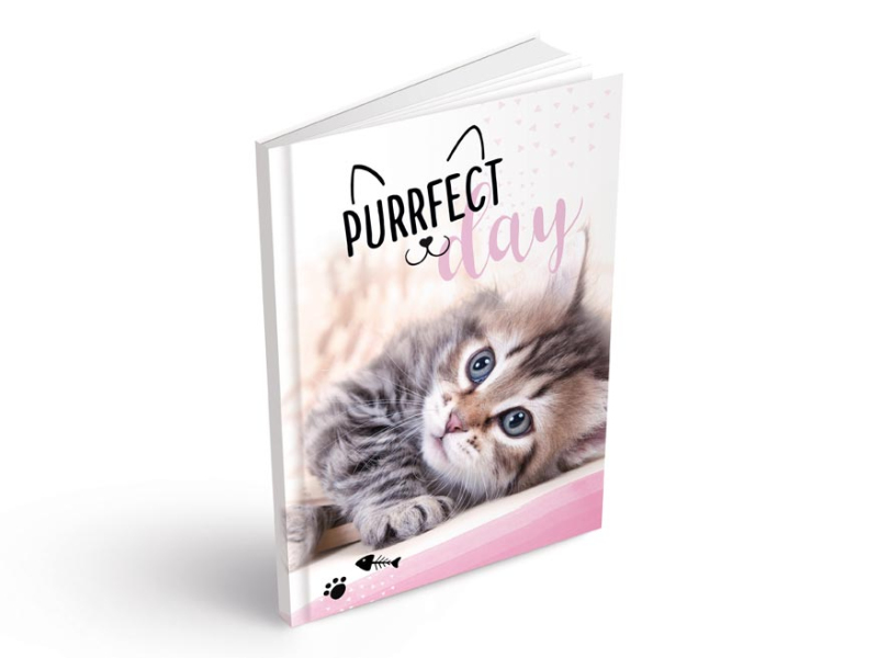 Záznamová kniha MFP s linajkami. Dosky sú z pevného lepeného kartónu s laminovaním. Na titulnej strane je spokojné mačiatko. Tieto bloky sú opatrené väzbou V8, ktorá patrí medzi najprepracovanejšie a najpevnejšie väzby. Počet listov: 100 Formát: A5 Motív: mačiatko Text: purrfect day Uvedená cena je za 1 ks