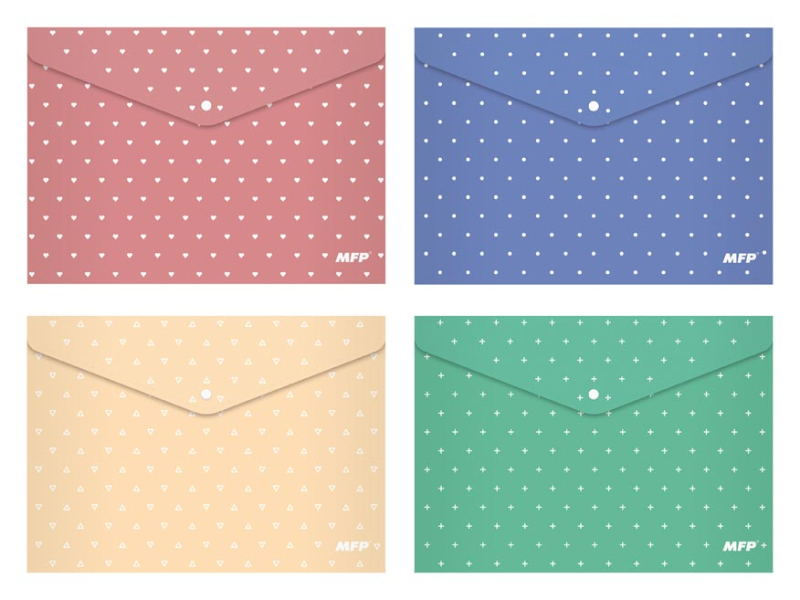 Zložka A4 z PolyPropylénu, ktorá sa zatvára pomocou cvoku. Zložka slúži ako pomocník na triedenie a ukladanie dokumentov, aby ste ich mali vždy pohromade. MATERIÁL: PP HRÚBKA MATERIÁLU: 0,21 mm FARBA: béžová, zelená, modrá, staroružová POTLAČ: srdiečka, bodky, trojuholníky, plusy Dodávame v mixe 4 ks podľa skladových zásob. Uvedená cena je za 1 ks.