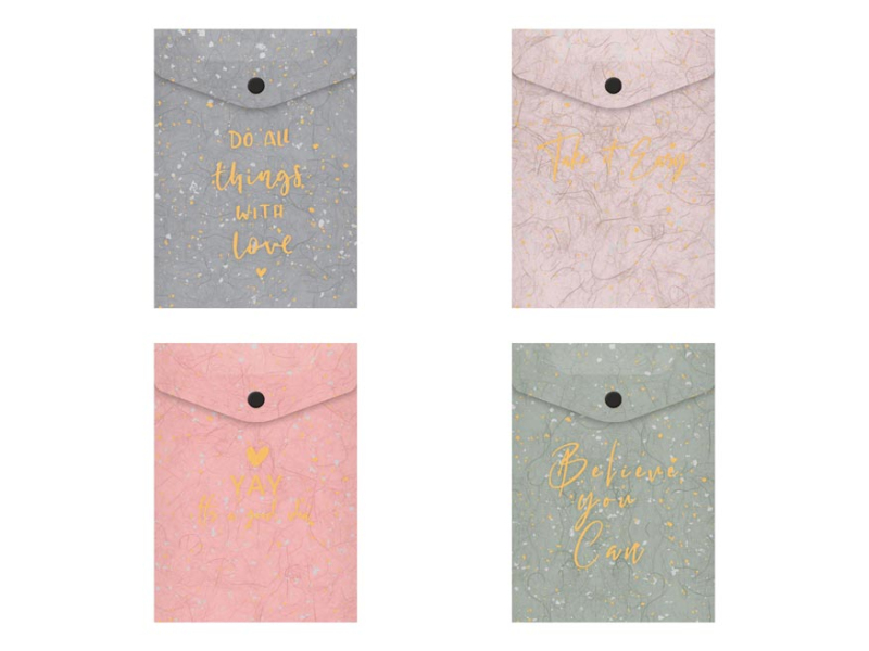 PP zložka A6 s cvokom, so zaujímavou textúrou a motivačným textom. Zložka slúži ako pomôcka na triedenie a ukladanie dokumentov, aby ste ich mali vždy pohromade. MATERIÁL: PP POTLAČ: motivačný text HRÚBKA MATERIÁLU: 0,21 mm FARBA: sivá, ružová, zelená, béžová Dodávame v mixe 4 ks podľa skladových zásob. Uvedená cena je za 1 ks.
