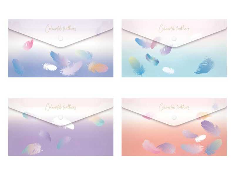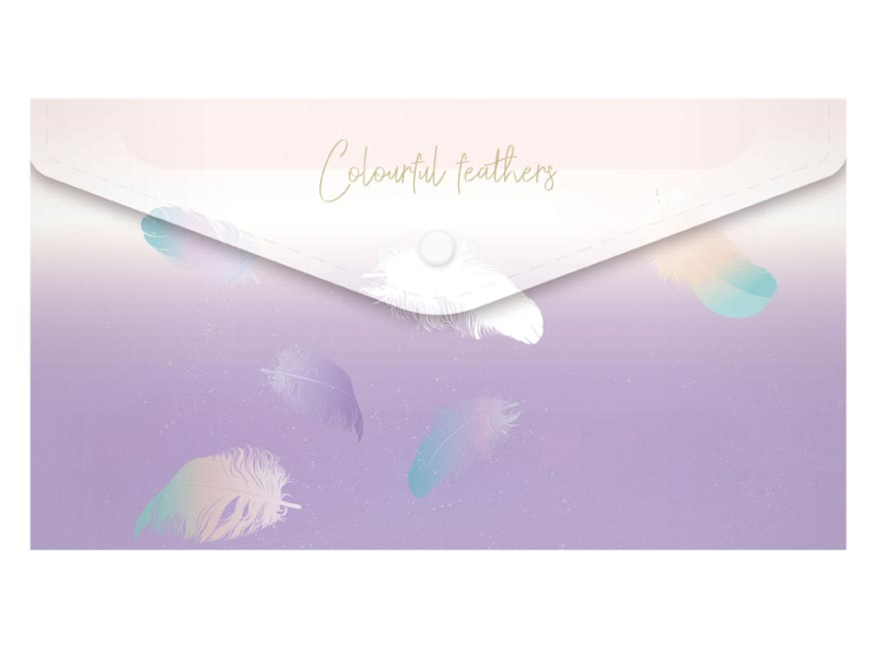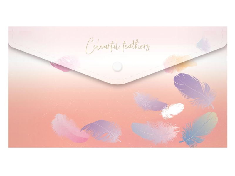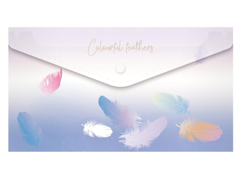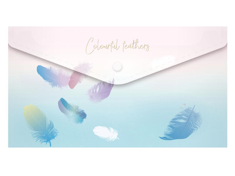 PP zakladač s cvokom o veľkosti DL, s motívom voľných pierok v kombinácii farieb. Vo veľkosti DL je papier A4 dvakrát preložený. Zložka slúži ako pomôcka na triedenie a ukladanie dokumentov, aby ste ich mali vždy pohromade. MATERIÁL: PP POTLAČ: pierka HRÚBKA MATERIÁLU: 0,21 mm Dodávame v mixe 4 ks podľa skladových zásob. Uvedená cena je za 1 ks.