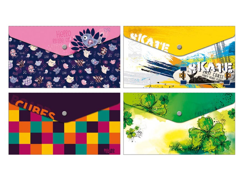 PP zložka s cvokom vo formáte DL. Formát DL je dvakrát preložený papier A4. Zložka slúži ako pomocník na triedenie a ukladanie dokumentov, takže ich budete mať vždy pohromade. MATERIÁL: PP HRÚBKA MATERIÁLU: 0,21 mm POTLAČ: farebné kocky, sovy, skate, štvorlístky Dodávame v mixe po 4 ks podľa skladových zásob. Uvedená cena je za 1 ks.