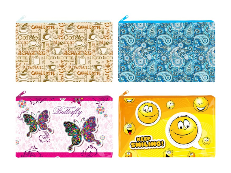 PP zložka so zipsom A5. Zložka slúži ako pomocník pre triedenie a ukladanie dokumentov, takže ich budete mať vždy pohromade, vhodná aj na písacie potreby a ďalšie pomôcky. Materiál: PP Rozmer: 240 x180 mm Motív: káva, motýle, mandaly, smajlíci Dodávame v mixe po 4 ks podľa skladovej zásoby. Uvedená cena je za 1 ks.