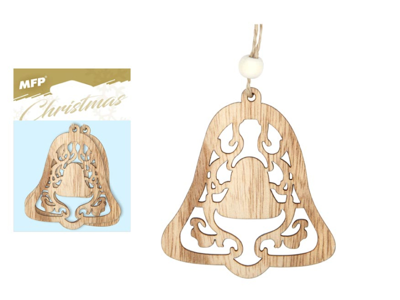 Vianočná drevená dekorácia – zvonček. 2 ks v balení. Ozdoba je opatrená šnúrkou, ktorá slúži na zavesenie. Vyrobená je z preglejky a z prírodných materiálov. Všetko je zabalené vo vrecúšku so závesom. Rozmery: 65 x 72 x 3 mm