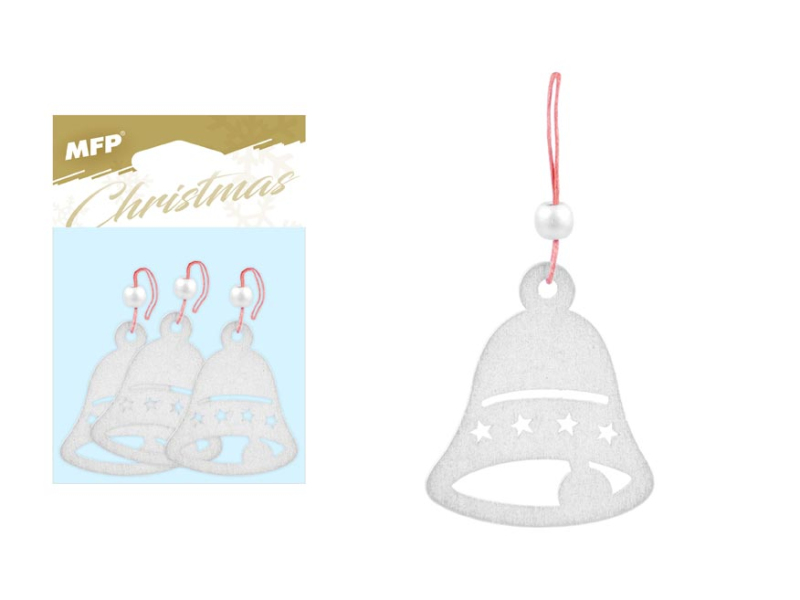 Drevený vianočný zvonček so šnúrkou na zavesenie. Táto vianočná dekorácia je striebornej farby. Môžete ju použiť na ozdobu vianočného stromčeka, zavesiť na dvere, na okno, alebo inak skrášliť váš byt. Balené vo vrecúšku so závesom. Balenie obsahuje 3 kusy.